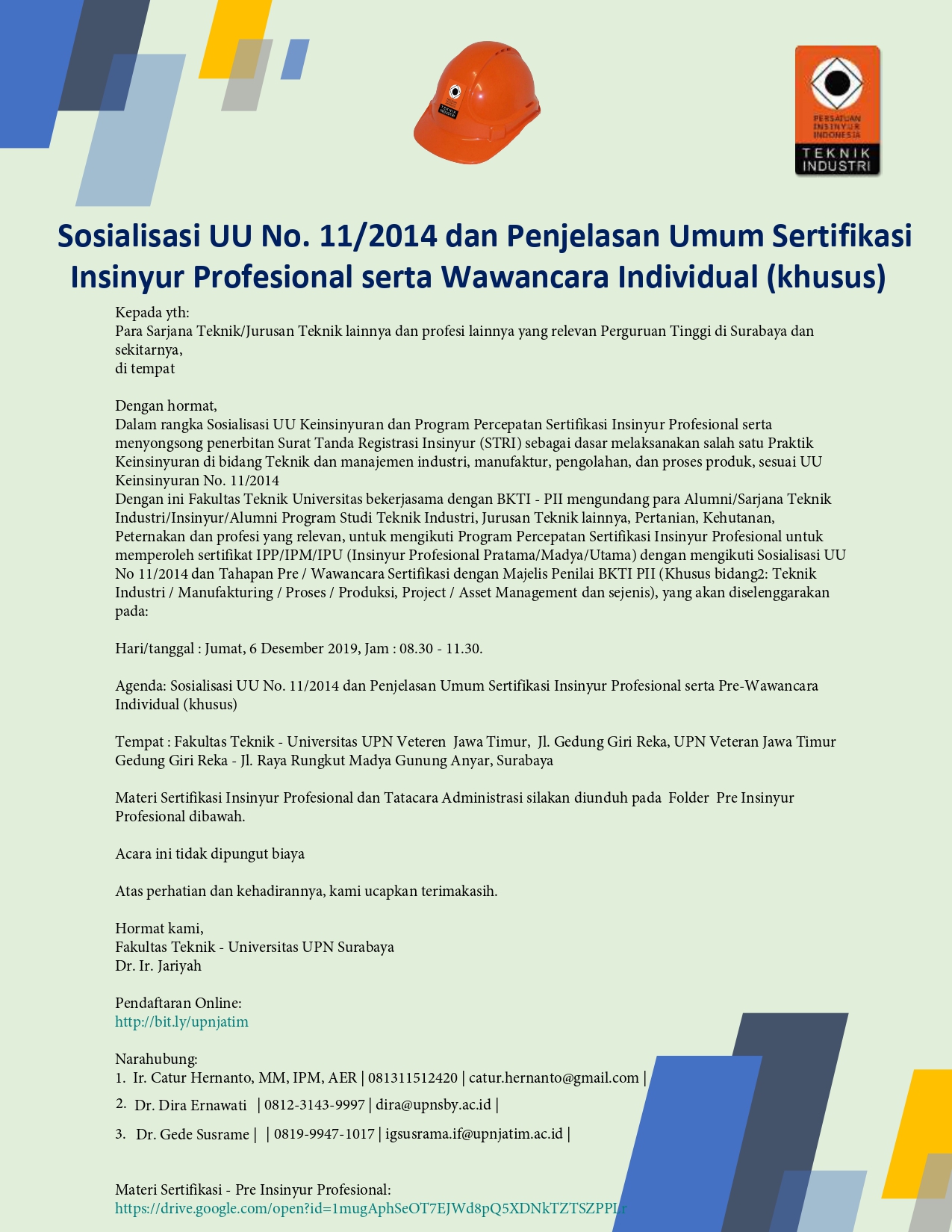 [Pengumuman] Sosialisasi UU No. 11/2014 dan Penjelasan Umum Sertifikasi Insinyur Profesional serta Pre-Wawancara Individual (khusus) UPN