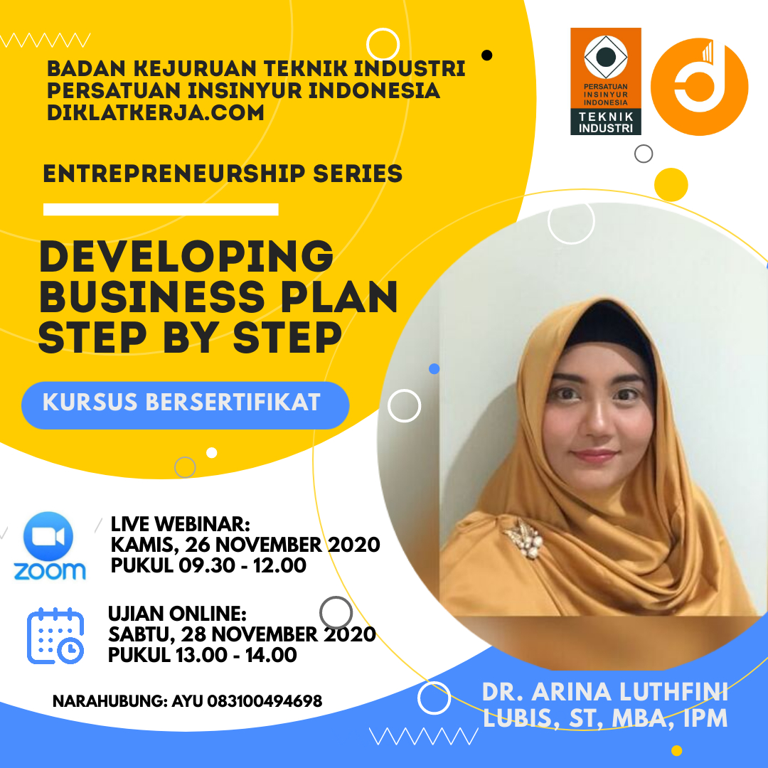Ikuti Webinar Entrepreneurship Series kerjasama Badan Kejuruan Teknik Industri PII (BKTI-PII) dengan diklatkerja.com: Materi: Developing Business Plan Step by Step Instruktur: Dr. Arina Luthfini Lubis, ST, MBA, IPM Hari/tanggal: Kamis,