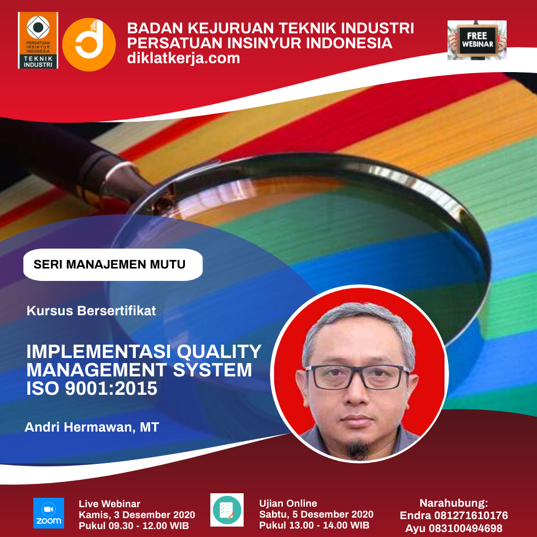 Ikuti Kursus Manajemen Mutu Seri-3 kerjasama Badan Kejuruan Teknik Industri Persatuan Insinyur Indonesia (BKTI-PII) dengan diklatkerja.com: Materi: Implementasi Quality Management System ISO 9001:2015 Instruktur: Andri Hermawan, MT Hari/tanggal: Kamis, 3