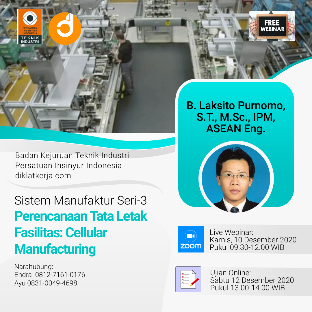 Ikuti Webinar Sistem Manufaktur Seri-3 kerjasama Badan Kejuruan Teknik Industri PII (BKTI-PII) dengan diklatkerja.com: Materi: Perencanaan Tata Letak Fasilitas: Cellular Manufacturing Instruktur: B. Laksito Purnomo, S.T., M.Sc, IPM, ASEAN Eng.