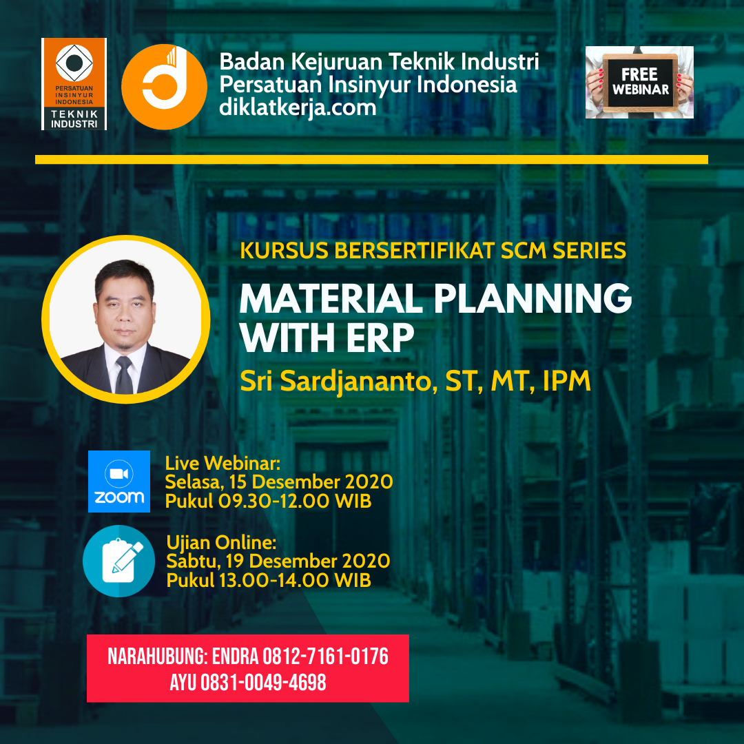 Ikuti Webinar SCM Seri-3 kerjasama Badan Kejuruan Teknik Industri PII (BKTI-PII) dengan diklatkerja.com: Materi: Material Planning with ERP Instruktur: Sri Sardjananto, ST, MT, IPM Hari/tanggal: Selasa, 15 Desember 2020 Waktu: