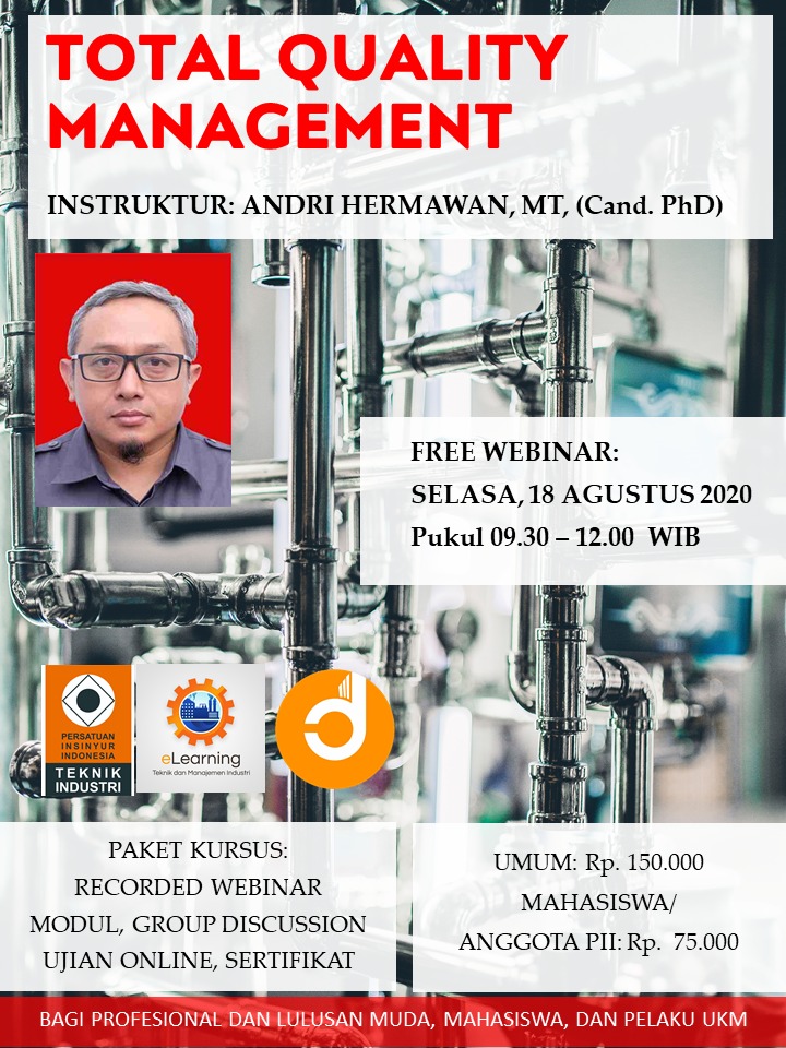 Salam Sejahtera. Semoga keselamatan dan kesehatan menyertai kita semua. Berikut kami sampaikan Jadwal Kursus Perdana Manajemen Mutu: Tema : TOTAL QUALITY MANAGEMENT Hari/tanggal : Selasa, 18 Agustus 2020 Waktu :