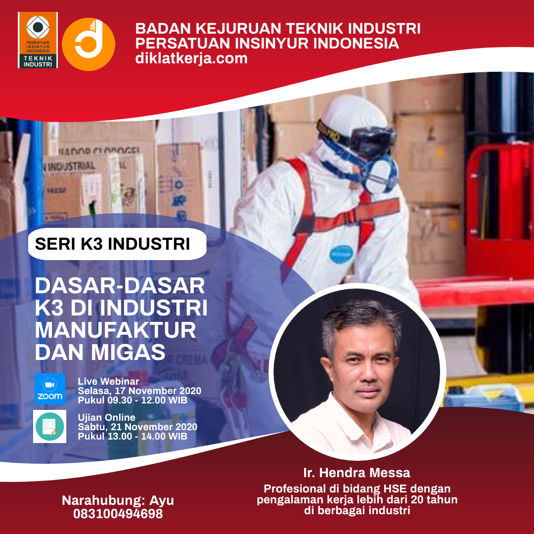 kuti Kursus Online Seri K3 Industri kerjasama Badan Kejuruan Teknik Industri PII (BKTI-PII) dengan diklatkerja.com: Materi: Dasar-dasar K3 di Industri Manufaktur dan MIgas Instruktur: Ir. Hendra Messa (Profesional di bidang