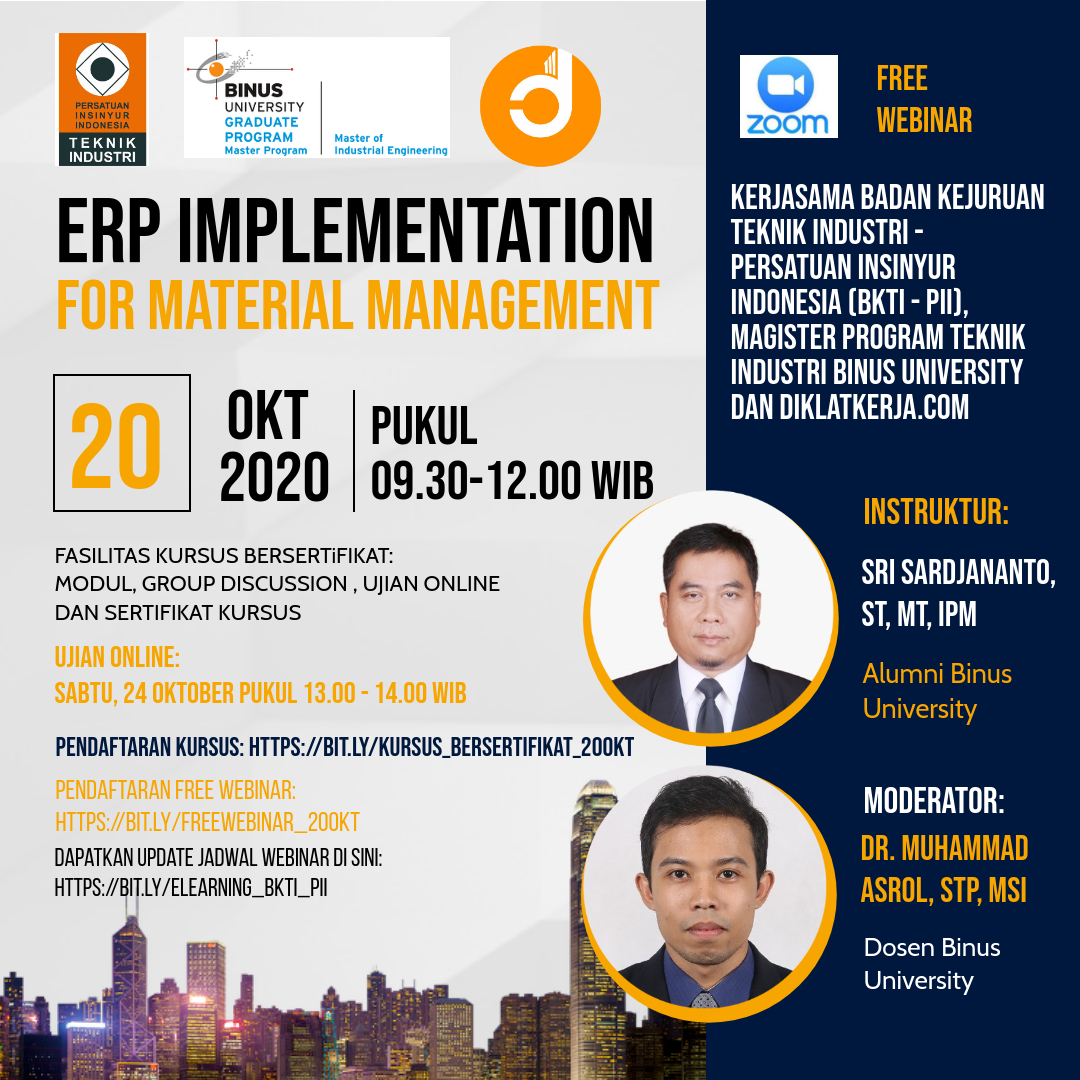 Kursus Online Seri Supply Chain Management Ikuti Kursus Online Seri Supply Chain Management kerjasama Badan Kejuruan Teknik Industri PII (BKTI-PII), Magister Program Teknik Industri Binus University dan diklatkerja.com: Materi: ERP