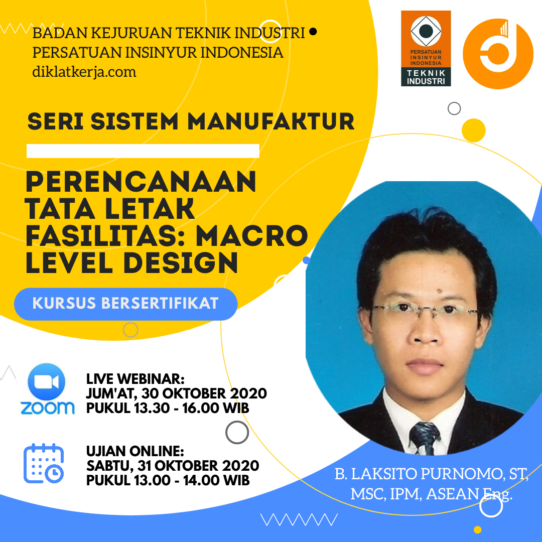 Kursus Online Seri Sistem Manufaktur Ikuti Kursus Online Seri Sistem Manufaktur kerjasama Badan Kejuruan Teknik Industri PII (BKTI-PII) dengan diklatkerja.com: Materi: Perencanaan Tata Letak Fasilitas: Macro Level Design Instruktur: B.