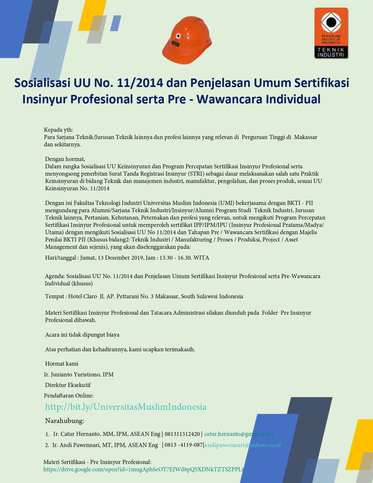 [Pengumuman] Sosialisasi UU No. 11/2014 dan Penjelasan Umum Sertifikasi Insinyur Profesional serta Pre-Wawancara Individual Universitas Muslim Indonesia