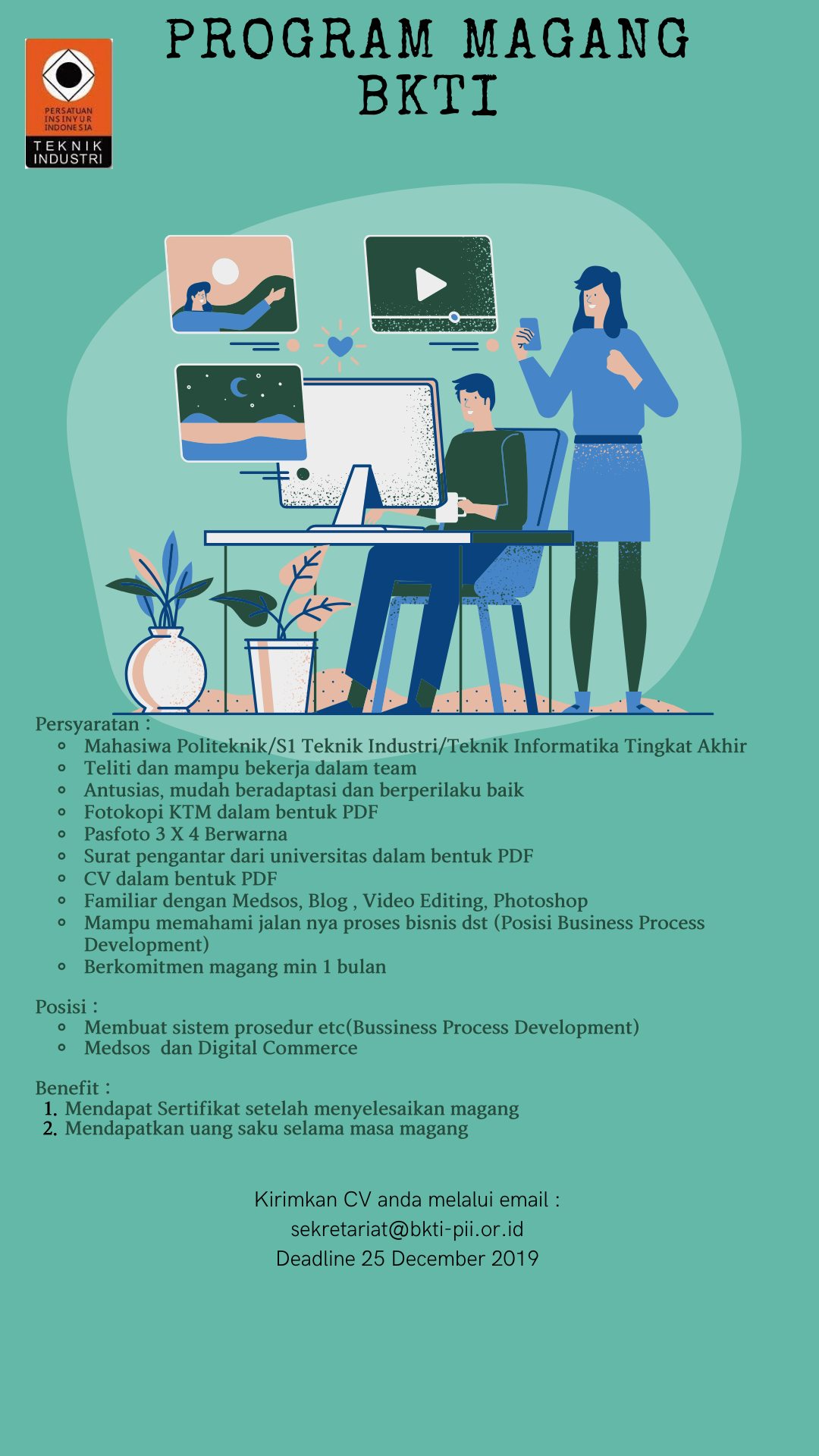Pengumuman : Lowongan Magang BKTI Persyaratan : Mahasiwa Politeknik/S1 Teknik Industri/Teknik Informatika Tingkat Akhir Teliti dan mampu bekerja dalam team Antusias, mudah beradaptasi dan berperilaku baik Fotokopi KTM dalam bentuk