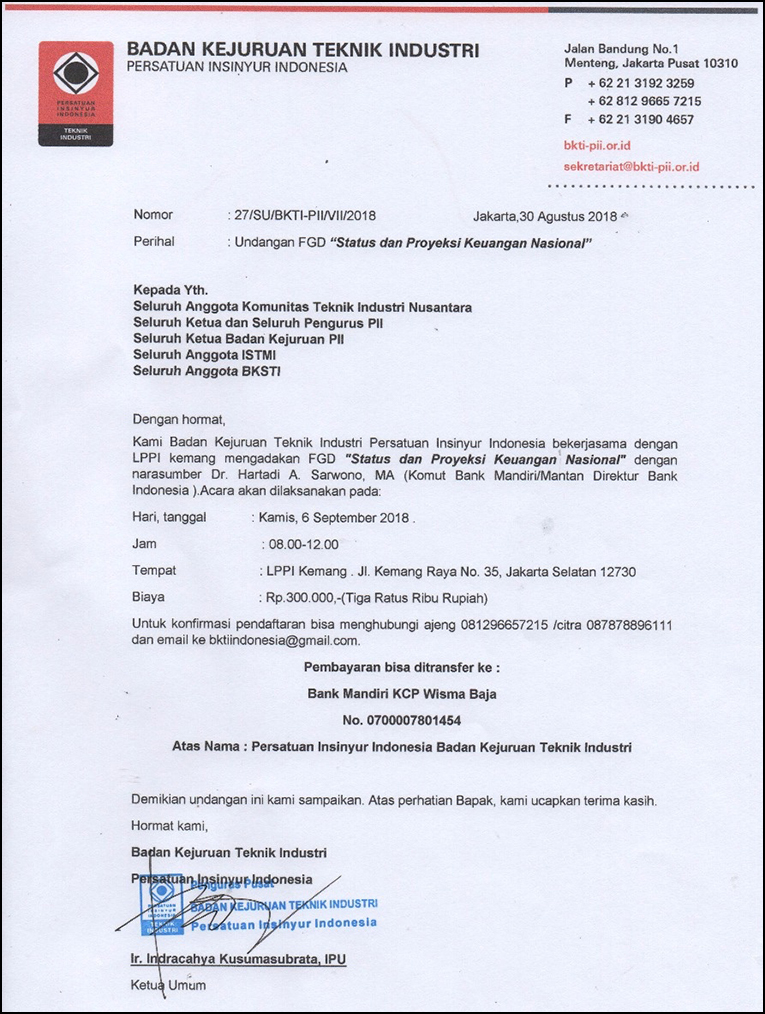 Undangan FGD “Status dan Proyeksi Keuangan Nasional” Kepada Yth. Seluruh Anggota Komunitas Teknik Industri Nusantara Seluruh Ketua dan Seluruh Pengurus PII Seluruh Ketua Badan Kejuruan PII Seluruh Anggota ISTMI Seluruh