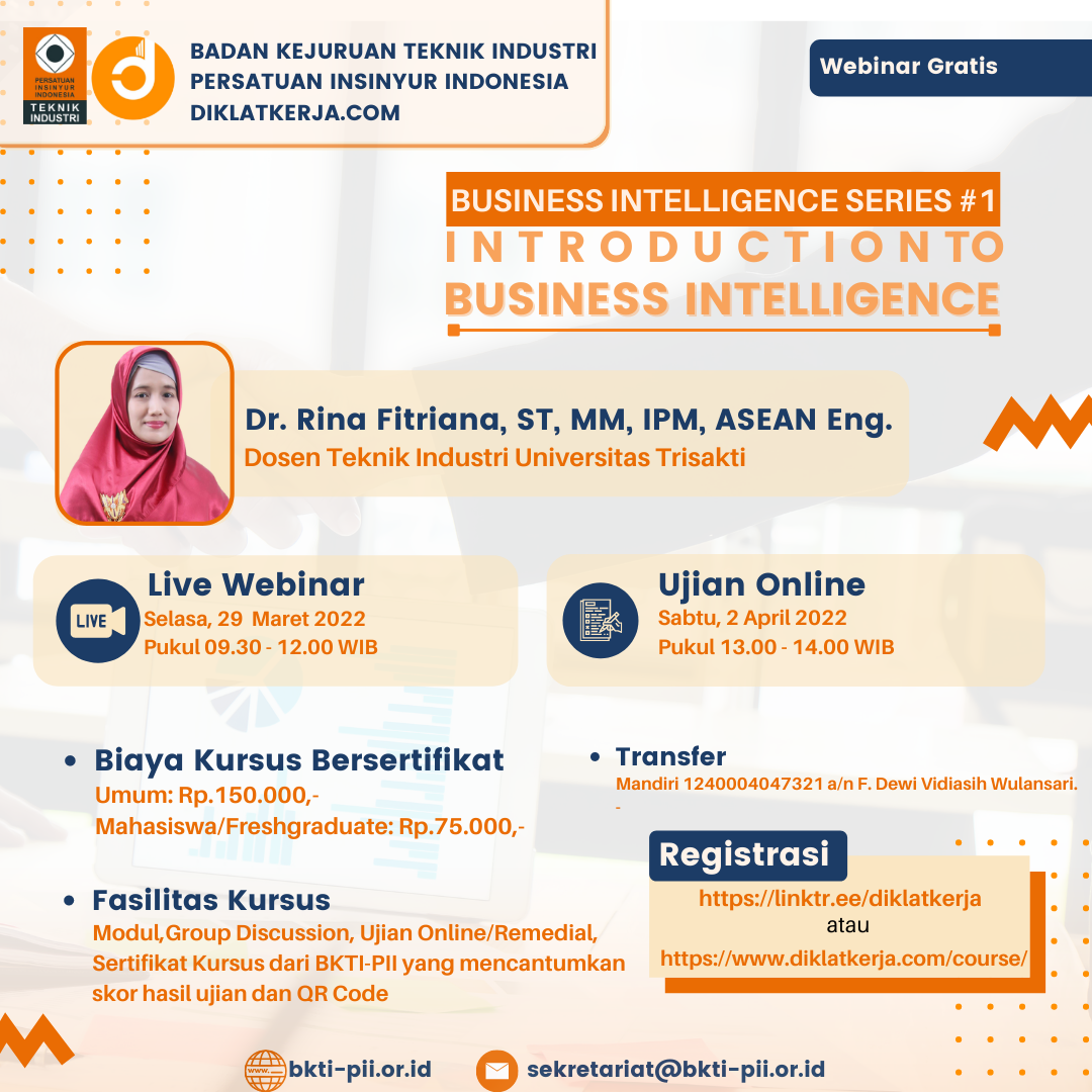 Tema : Introduction to Business Intelligence Instruktur : Dr. Rina Fitriana, ST, MM, ASEAN Eng. (Dosen Teknik Industri niversitas Trisakti) Tanggal : Selasa, 29 Maret 2022 Waktu : Pukul 09.30
