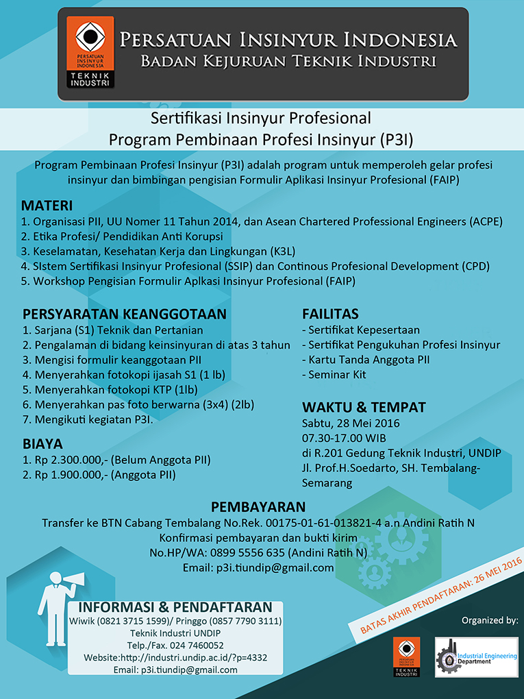 Sertifikasi Insinyur Profesional – Program Pembinaan Profesi Insinyur (P3I) (Semarang 28 Mei 2016) Download JPG file : Flyers_BKTI_UNDIP.jpg