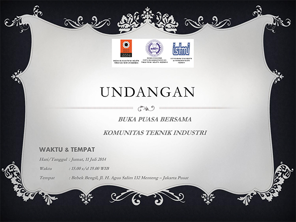 Perihal : Undangan Buka Puasa Bersama Komunitas Teknik Industri Dengan hormat, Sehubungan dengan kegiatan 9 program pengembangan Teknik Industri Nasional yang akan dilaksanakan oleh Badan Kejuruan Teknik Industri Persatuan Insinyur
