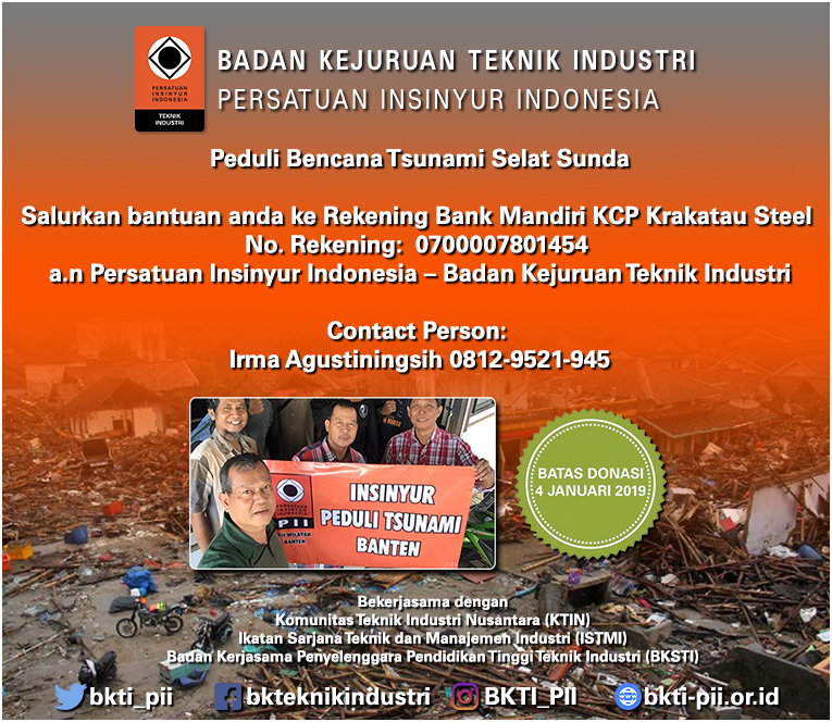 Persatuan Insinyur Indonesia melalui Badan Kejuruan Teknik Industri (BKTI PII) Peduli mengajak rekan-rekan semua untuk ikut serta membantu saudara-saudara kita yang tertimpa bencana tsunami di Banten dan sekitarnya. Bantuan dana dapat ditransfer ke rekening Bank Mandiri KCP Krakatau Steel no. Rekening: Mari kita bersama ulurkan tangan untuk meringankan beban saudara-saudara kita di Banten dan sekitarnya. BKTI PII Peduli Contact Person: Irma Agustiningsih 0812-9521-945 |