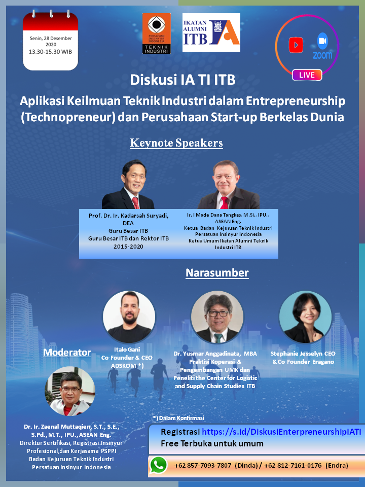 Ikatan Alumni Teknik Industri ITB bekerjasama dengan Badan Kejuruan Teknik Industri Persatuan Insinyur Indonesia , mengundang Bapak dan Ibu pada kegiatan Live Discussion dengan tema “Aplikasi Keilmuan Teknik Industri dalam Entrepreneurship Technopreneur dan Perusahaan Start-up Berkelas Dunia” . Undangan ini gratis terbuka untuk alumni Teknik Industri ITB dan masyarakat umum dengan tujuan membantu pemerintah membangun entrepreneurship baru di Indonesia .