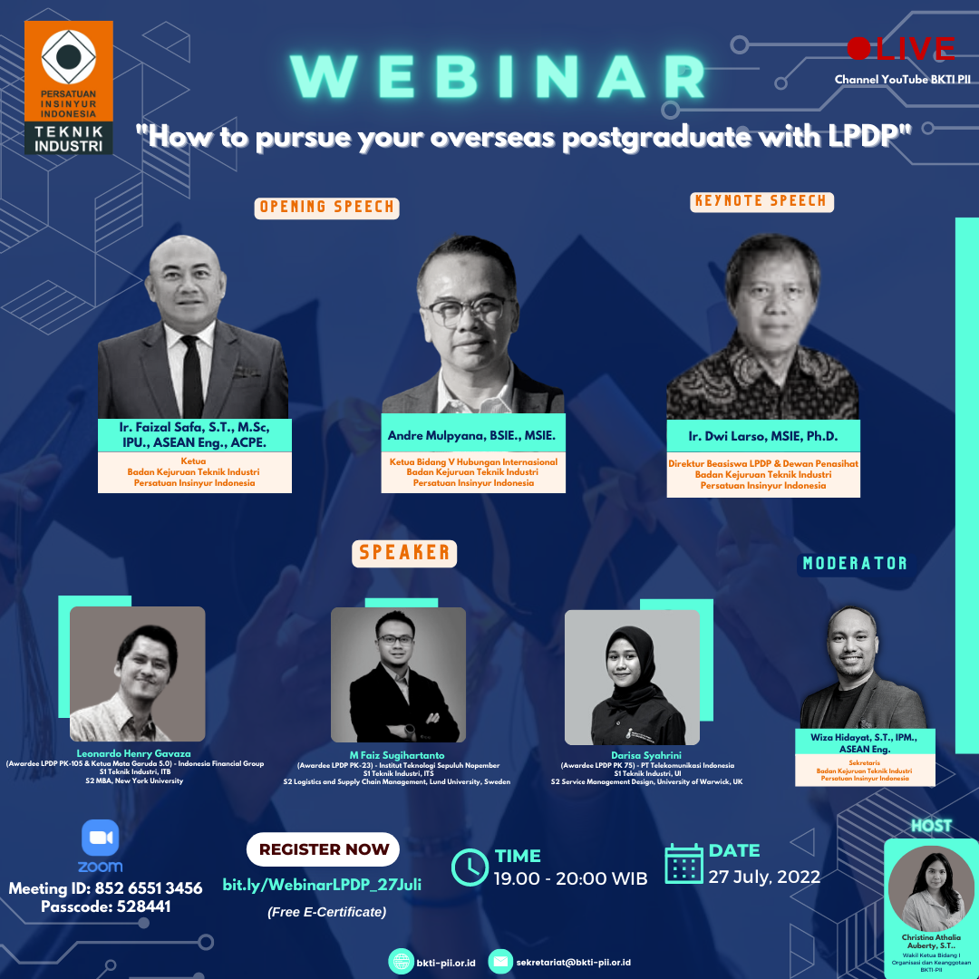 Salam Insinyur Indonesia! . . . — BKTI PII Presents Badan Kejuruan Teknik Industri | Persatuan Insinyur Indonesia Webinar: “How to pursue your overseas postgraduate with LPDP” Rabu, 27 Juli