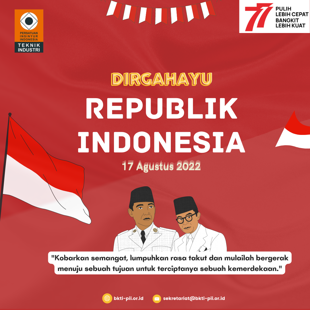 — Badan Kejuruan Teknik Industri Persatuan Insinyur Indonesia (BKTI-PII) mengucapkan, Selamat Memperingati Hari Kemerdekaan Republik Indonesia ke-77 “Mengenang jasa para pahlawan perlu dilakukan sebagai semangat dalam menjaga kemerdekaan bangsa ini”