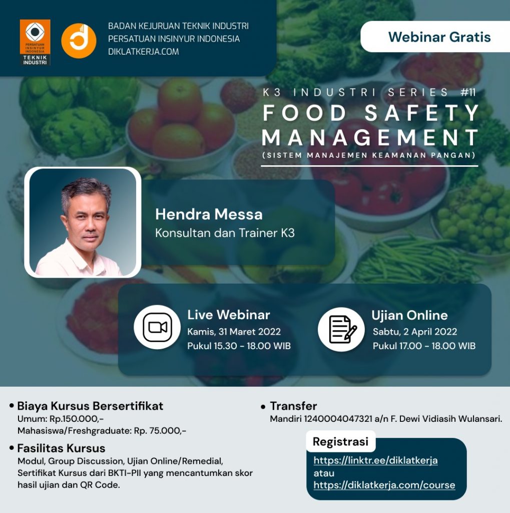 Pendaftaran: www.diklatkerja.com/course/food-safety-management-sistem-manajemen-keamanan-pangan/
