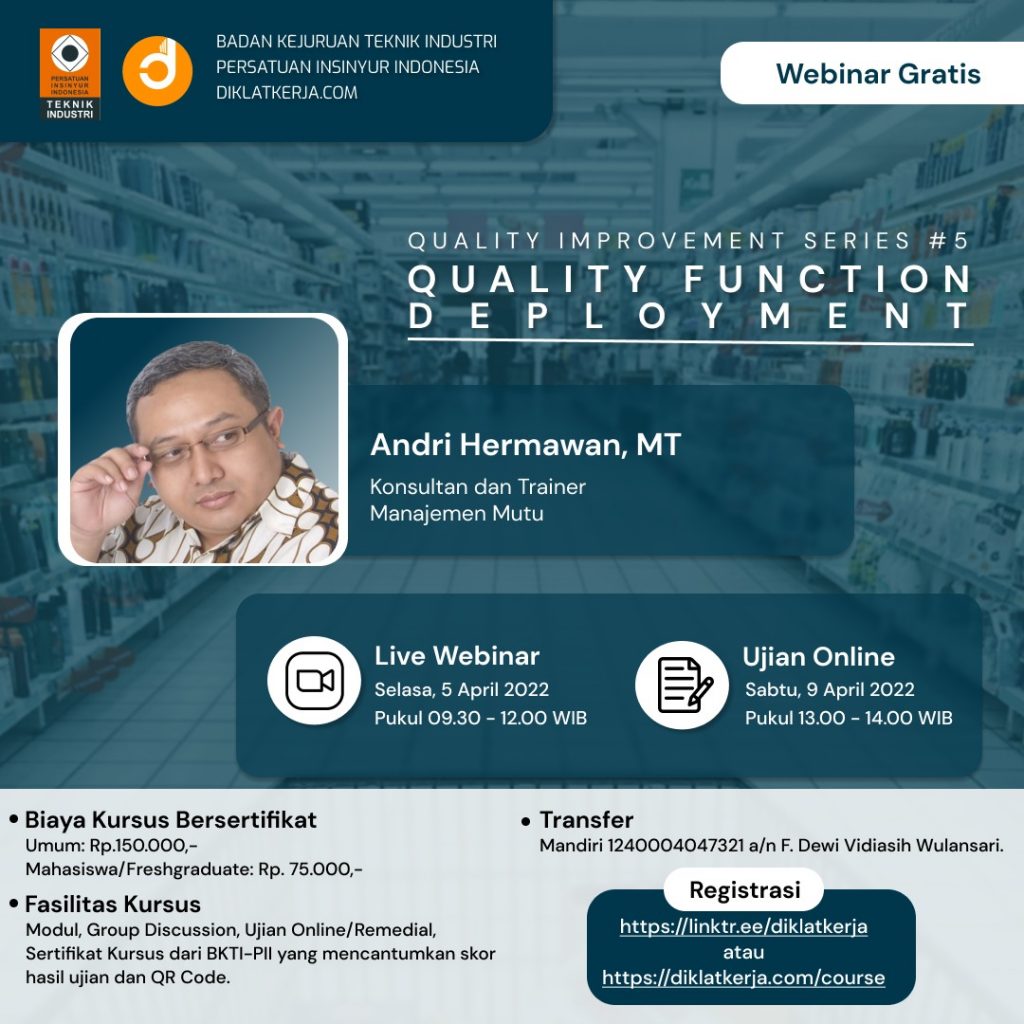 Pendaftaran: https://www.diklatkerja.com/course/quality-function-deployment/