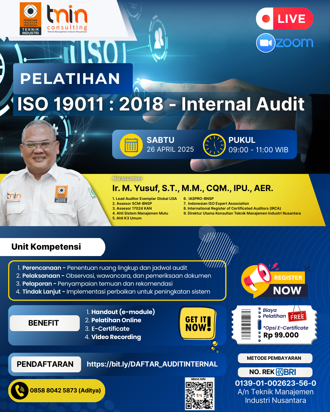 Online [ Zoom Meeting ]Serangkaian rencana produksi yang sudah dihasilkan dalam setiap langkah berujung pada eksekusi semua Order dan Job Produksi pada Sumber Daya Lantai Produksi. Pengendalian produksi berupa Penjawalan Operasi setiap Job Produksi dengan memperhatikan Waktu Pengerjaan Job di suatu stasiun kerja secara lokal dan mempertimbangkan performansi terselesainya semua order secara keseluruhan. Instruktur: Ir. B. Laksito Purnomo, S.T.,...