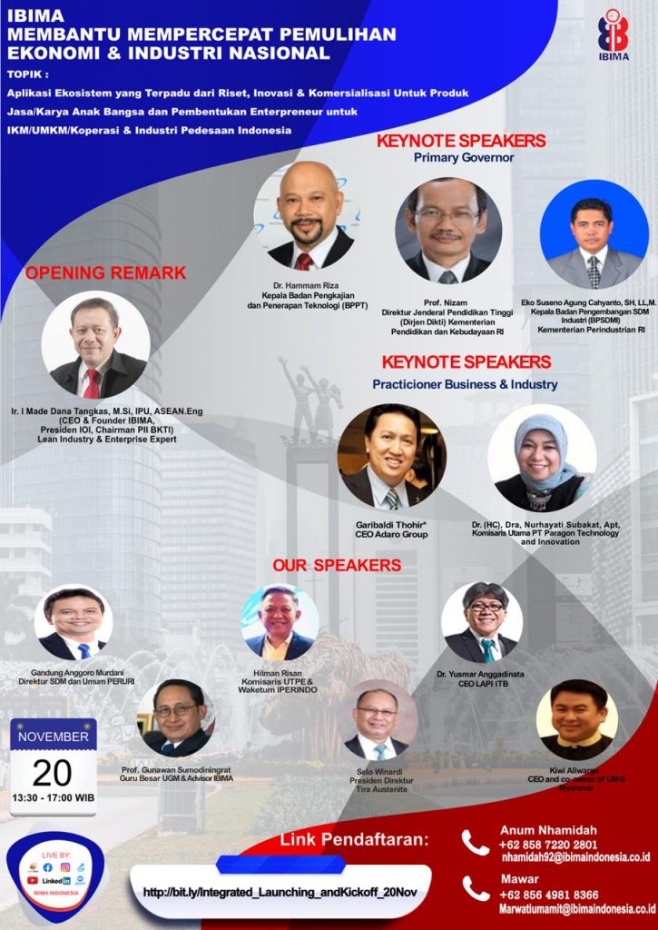 Integrated Launching & Kick Off : IBIMA Membantu Mempercepat Pemulihan Ekonomi & Industri Nasional : Aplikasi Ekosistem yang Terpadu dari Riset, Inovasi & Komersialisasi untuk Produk/Jasa Karya Anak Bangsa dan Pembentukan Enterpreneur untuk IKM/UMKM/Koperasi & Industri Pedesaan Indonesia