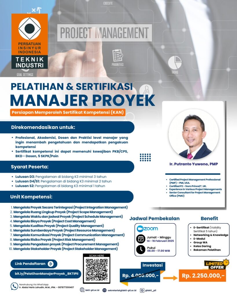 Kini saatnya naik level bersama Ir. Putranto Yuwono, PMP (Certified Project Management Professional – PMI, USA) dalam Pelatihan & Sertifikasi Manajer Proyek yang dirancang untuk membekali Anda dengan keterampilan, wawasan, dan kredibilitas yang dibutuhkan untuk sukses!