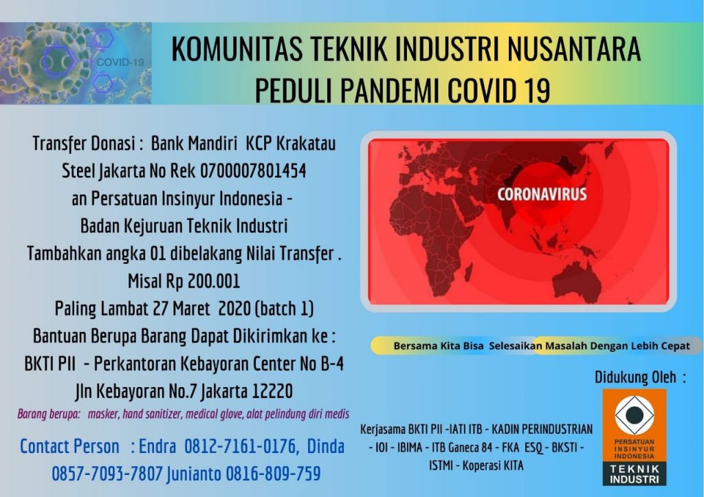 menyikapi perkembangan COVID-19, KTIN peduli agar wabah tersebut bisa segera cepat diselesaikan untuk menghindari dampak yang lebih jauh. Untuk itu , bagi Bapak dan Ibu Komunitas Teknik Industri Nusantara yang ingin memberikan donasi silakan kirim ke Bank Mandiri Rek. No. 0700007801454 an Persatuan Insinyur Indonesia – Badan Kejuruan Teknik Industri. Mohon memberikan kode angka 1 diangka terakhir pada donasi yang diberikan. Misal donasi sebesar rp 500.001.