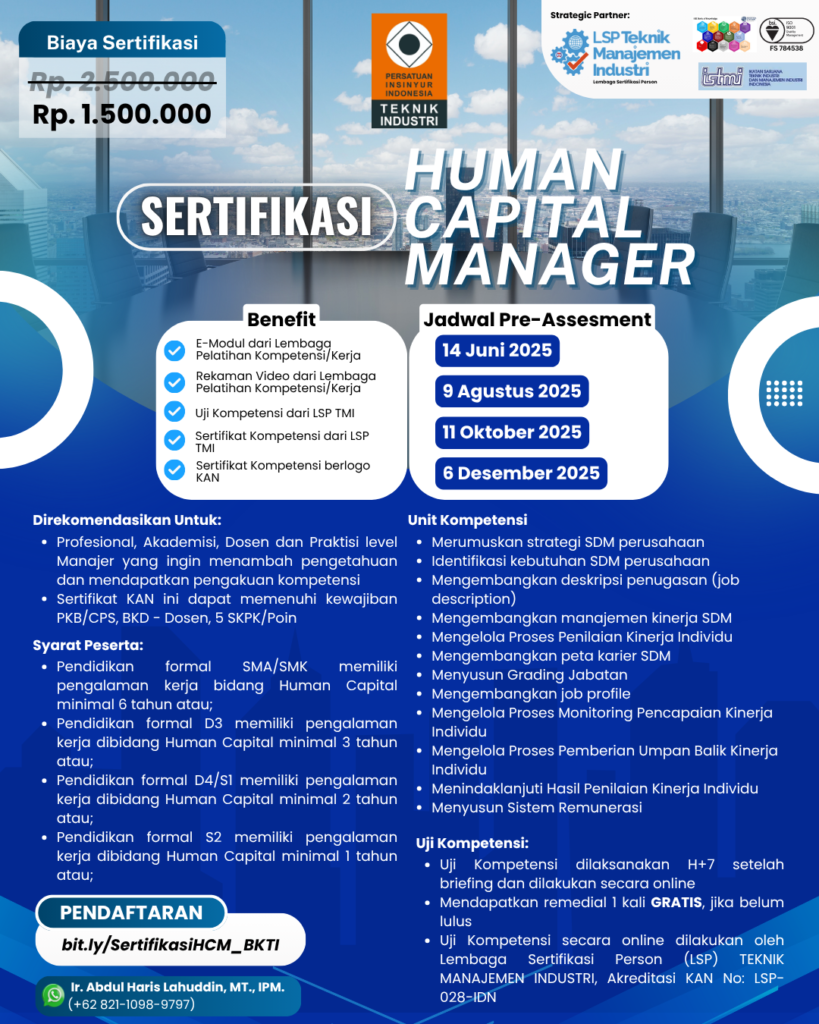 Bergabunglah dalam program SERTIFIKASI HUMAN CAPITAL MANAGER yang diselenggarakan oleh Badan Kejuruan Teknik Industri – Persatuan Insinyur Indonesia bekerja sama dengan LSP Teknik Manajemen Industri.
